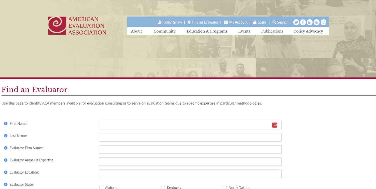 There are several ways to find evaluators suited for your needs. One of my most common recommendations is the American Evaluation Association’s Find an Evaluator tool. Here, you can search by city or state to find someone local, by area of expertise to find someone with the background you need, or by name or firm name if you’ve already got someone in mind.