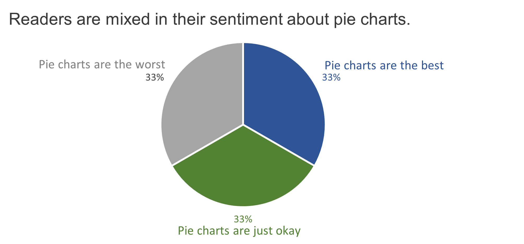 Pie charts are a classic way to present parts of a whole data. However, they can be controversial. Some data visualization experts think this format can create difficulties in gauging the differences between “slices.” But it is clearly an accessible, compact, and well-known format for this data type.